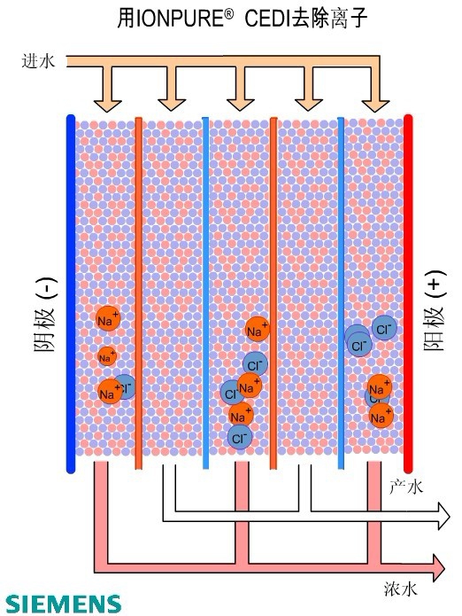 EDI過程一般城市水源中存在鈉、鈣、鎂、氯化物、硝酸鹽、碳酸氫鹽等溶解物。這些化合物由帶負電荷的陰離子和帶正電荷的陽離子組成。通過反滲透預(yù)處理,99%以上的離子可以被除去。另外,原水中也可能包括其他微量元素、溶解的氣體(例如CO2)和一些弱電解質(zhì)(例如硼,二氧化硅)這些雜質(zhì)在工業(yè)除鹽水中必須被除掉。但是反滲透過程對于這些雜質(zhì)的清除效果較差。